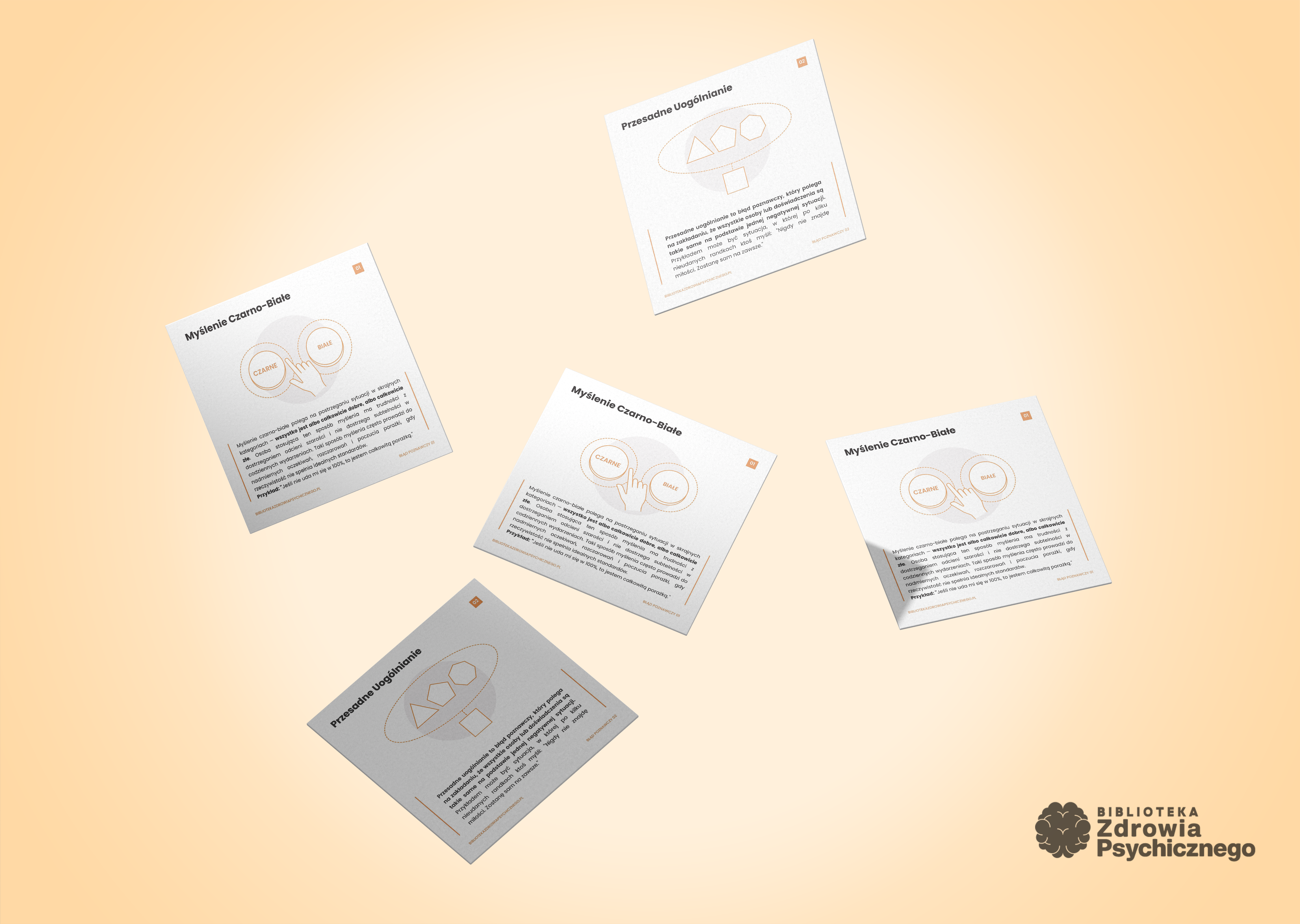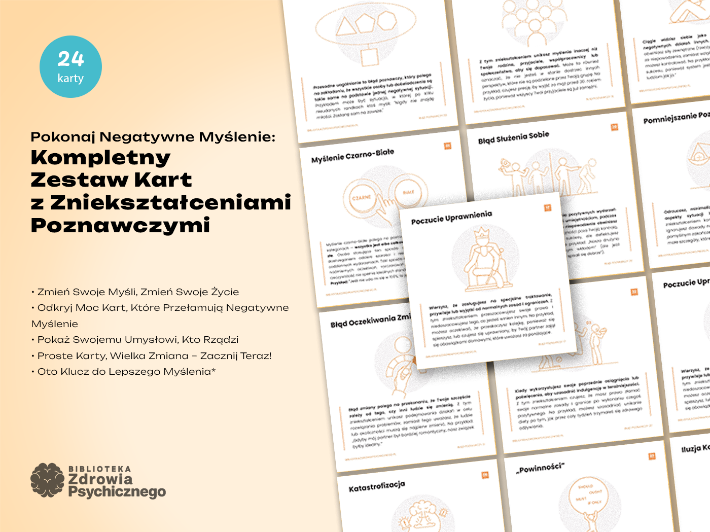 Zestaw 24 starannie opracowanych kart, każda dedykowana konkretnemu zniekształceniu poznawczemu. Każda karta zawiera: